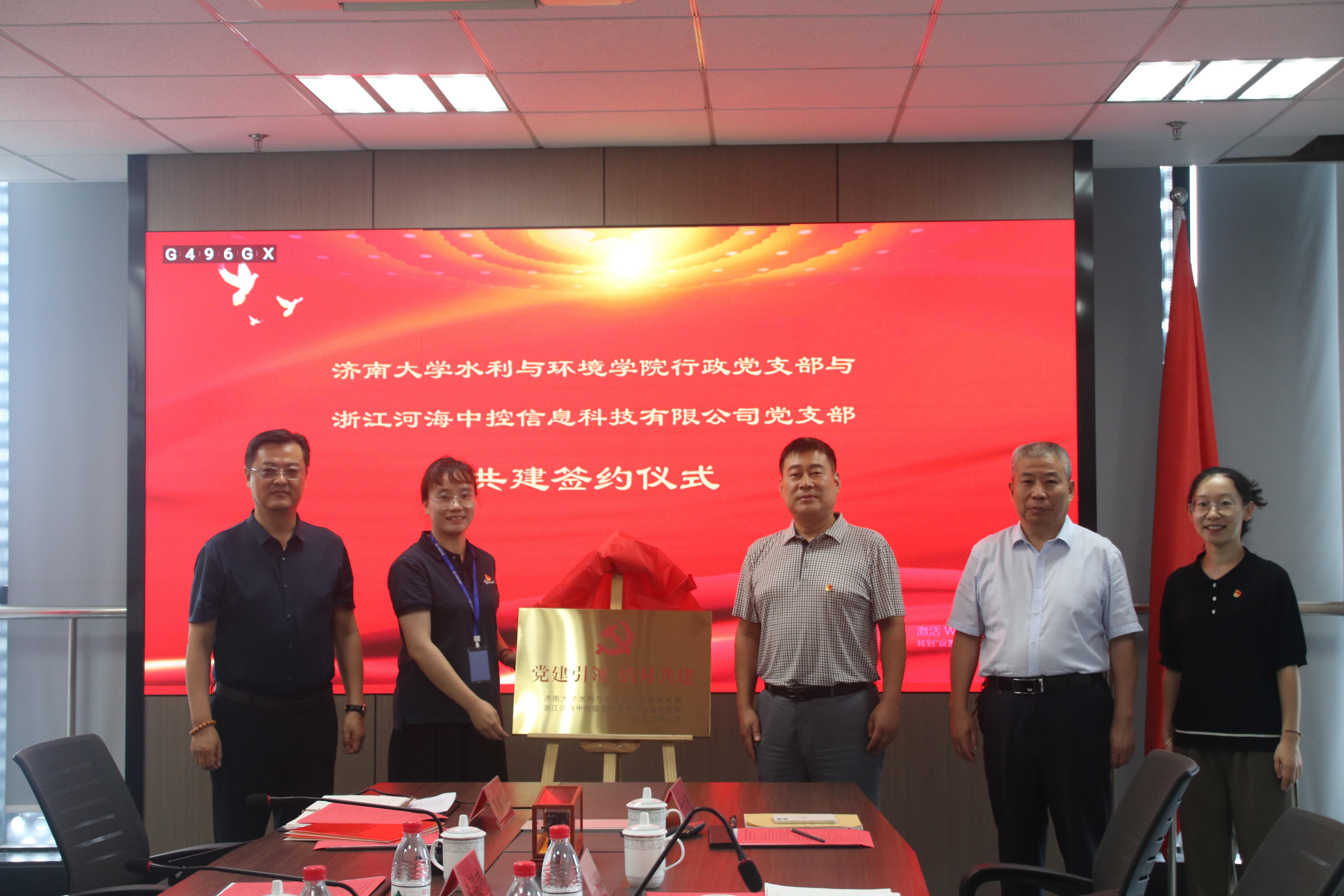 行政党支部与河海中控信息科技有限公司党支部”共建签约揭牌仪式。高璐燕介绍了河海中控党支部情况,她希望将支部共建作为加强学习交流的重要平台,以不断增强党建活力,提升党建工作水平。王义指出,嘉兴是党的诞生地、红船精神的发源地,要充分利用红色教育资源,发挥充分党建引领作用,服务国家战略需求,推动科研与产业对接,进一步提升党建服务保障水平。随后双方签订共建协议,高璐燕与王义共同为支部共建揭牌。