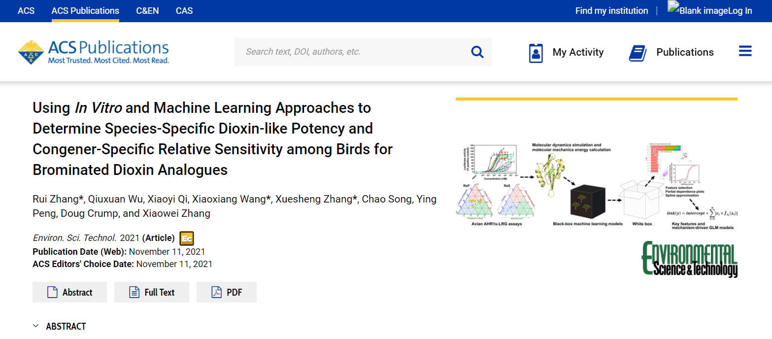 张睿课题组在高关注度持久性有机污染物(POPs)溴代二噁英的毒性预测研究方面取得重要进展。该研究基于体外荧光报告基因实验、分子动力学模拟和机器学习算法等提出了一种可准确定性预测鸟纲物种特异的溴代二噁英类二噁英活性及其种间相对敏感性的广义线性模型,为优先控制类二噁英化合物的筛查以及在氨基酸水平上揭示其它脊椎动物对类二噁英活性的种间敏感性差异的机制提供了一种新策略。该成果以“UsingIn Vitroand Machine Learning Approaches to Determine Species-Specific Dioxin-like Potency and Congener-Specific Relative Sensitivity among Birds for Brominated Dioxin Analogues”为题,在环境领域顶级期刊《Environmental Science & Technology》上发表。该研究受到高度评价,被美国化学学会(ACS)推荐为ACS Editors' Choice文章进行亮点报道,并在ACS网站作为头条新闻展示。该研究工作得到了国家自然科学基金、山东省自然科学基金等项目的大力支持。