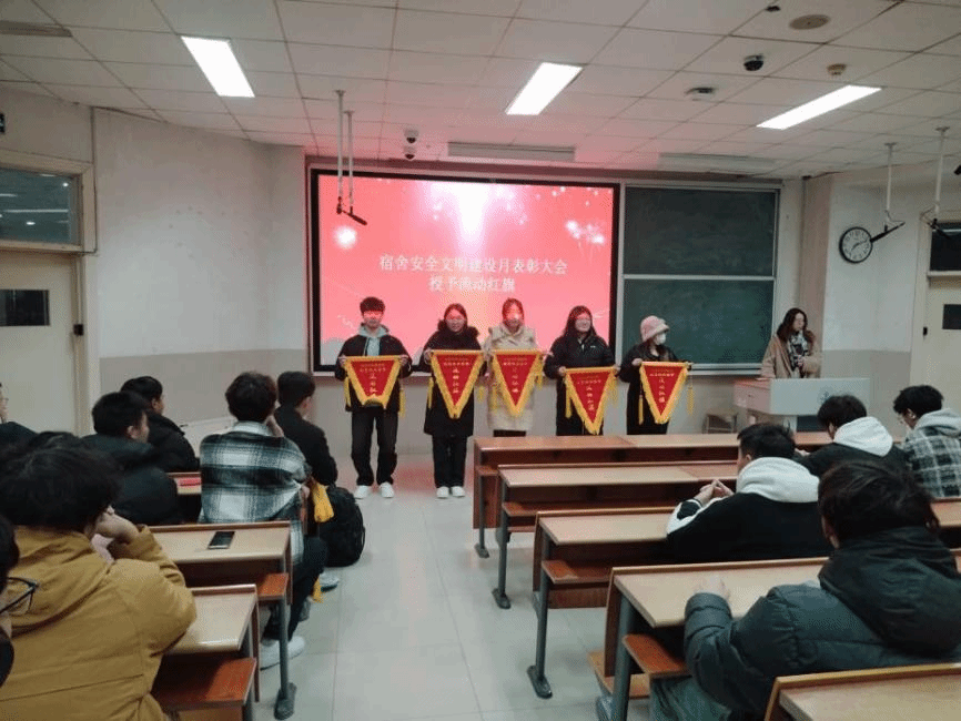 活动尾声,学院对建设月活动中的优秀宿舍进行了评选和表彰。根据检查结果,评比选出四个年级共12个“优秀标兵宿舍”并为其颁发流动红旗,树立模范榜样,进一步调动广大同学对学生公寓整改美化工作的积极性。