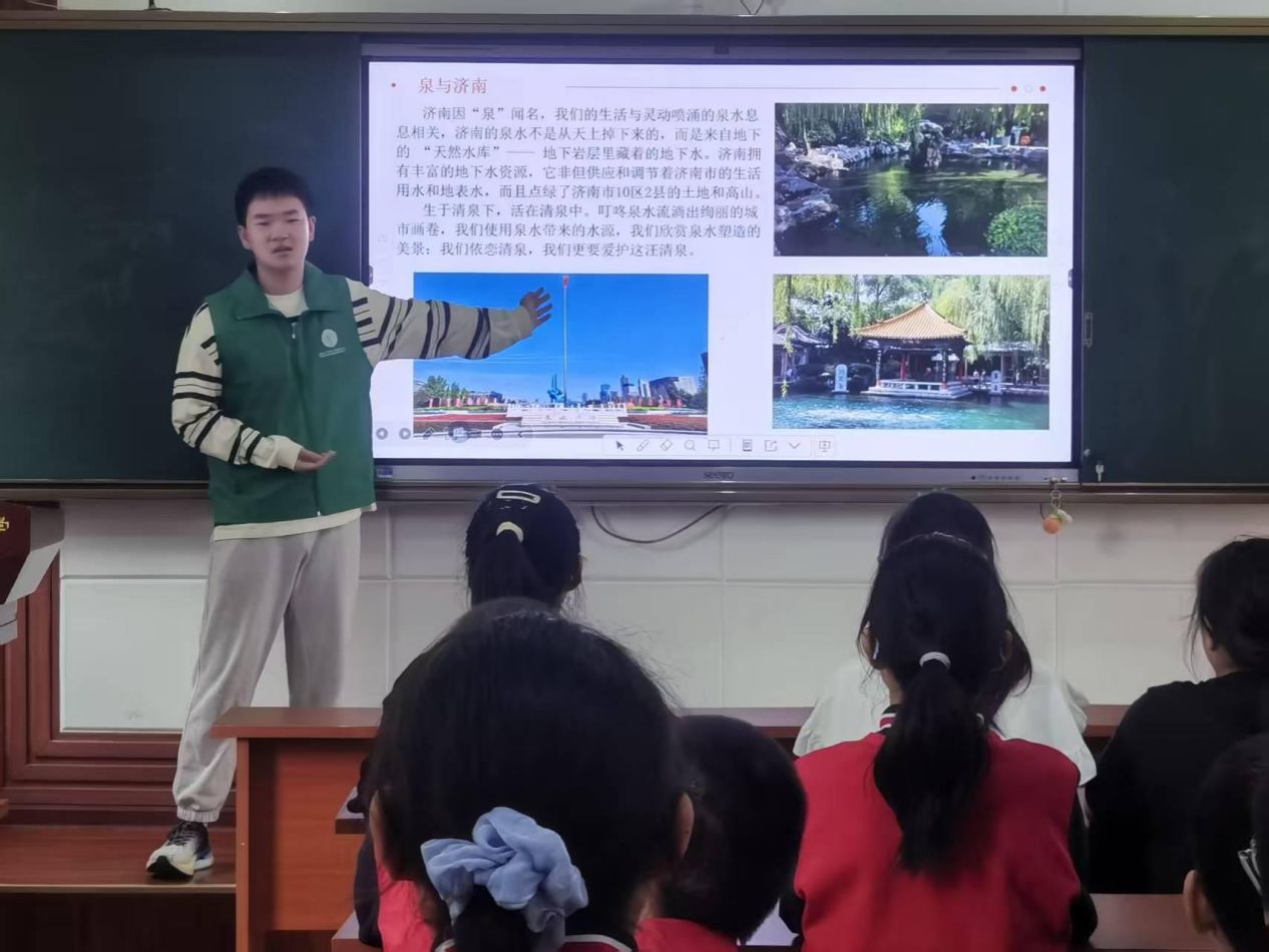“济南的泉水从哪来?”宣讲开篇,张泓轩用“地下水库”的比喻,讲解济南地下水对城市供水、绿化的作用——“我们喝的水、公园的绿植,都靠这片地下水资源滋养”。随后聚焦黄河,通过短视频展示黄河5400公里的奔腾历程,点明其“中华民族母亲河”的身份,更揭秘关键关联:“黄河就像地下水库的‘邻居’,河水通过岩层渗透,给地下水‘补水’,黄河生态好,泉水才更有活力。”