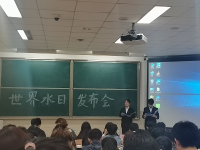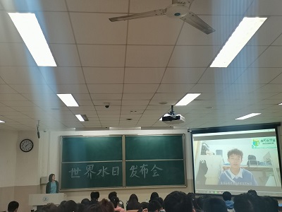 会议伊始,主持人李如悦和赵金铭向全体到会人员讲解本次活动的重要意义。主讲人梁宇莹悉心讲解世界水日和中国水周的由来和深层含义,并从现今水资源情况、水资源浪费破坏、节约用水保护水资源等几个方面深刻阐述了保护水资源的重要意义。她在演讲中穿插了生动形象的动画视频以及当代大学生对水资源现状的看法,更清楚地让同学们了解保护水资源的必要性、紧迫性,并呼吁同学们关注生态环境,增强社会责任感,做到合理用水、节约用水。