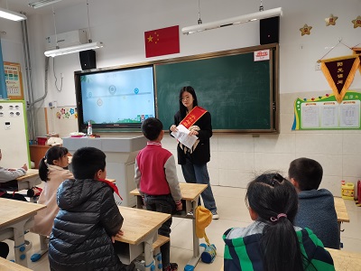 志愿者在学生会社服部部长冯芳园的带领下,前往卧龙小学开展生活垃圾分类主题宣讲。