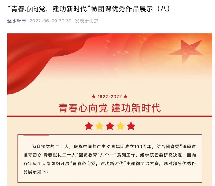 各支部组织广大师生党员通过人民网 “红色云展厅”线上平台组织红色展馆网上参观,采取集中观看、个人自行浏览等方式,线上参观了“山东——济南大峰山党性教育基地”、“红色云展厅——渡江战役”等;组织红色主题论坛,开展了“疫情防控形势下如何发挥一名党员一面旗帜,一个支部一座堡垒的先锋模范作用”主题讨论;开展红色主题班团活动,开展“砥砺奋进守初心,青春献礼二十大”主题教育实践活动和“党的青年运动史”“新时代的伟大成就”等主题团日活动;上好红色思政大课,书记和院长带头为广大师生讲授“学习党代会精神,勇担新时代使命”和“弘扬伟大抗疫精神,推动学院高质量发展”思政课;开展红色主题征文活动,组织“喜迎二十大,同读一本书”系列活动,学生积极踊跃参加,共收到“书卷始于声,永远跟党走”线上诵读作品24件,“青春献礼二十大,强国有我新征程”读书征文作品32件,“秀丹青书法,展墨林之风”摘抄作品35件;过好“红色传承”为主题的组织生活,开展“喜迎党的二十大,砥砺奋进新征程”为主题的组织生活,集中观看灯塔大课堂第34课;举办红色文艺演出,开展“以艺抗疫、艺展风采”公寓文化艺术节线上系列活动,通过多种文艺形式歌颂青春、歌颂祖国、歌颂党;组织红色历史知识竞赛,面向全院团支部开展“青春心向党,建功新时代”主题微团课大赛;产生红色文化研究成果,学院获评2022年学校党建研究课题2项。
