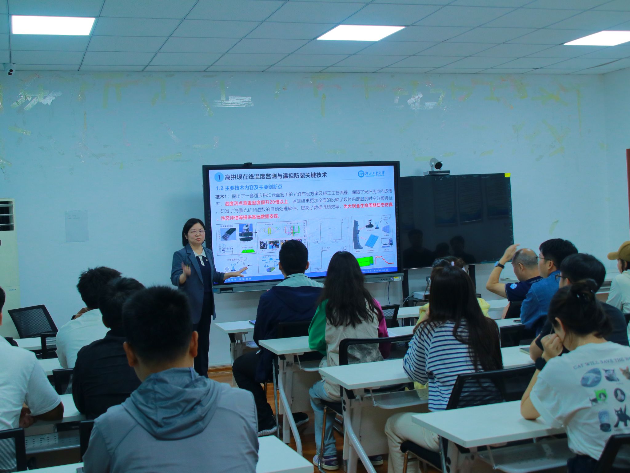 赵春菊教授围绕大型工程智能建造技术的前沿研究成果与工程实践案例展开了系统而深入的讲解。她以团队长期深耕的三峡、白鹤滩、乌东德等国家重大水利水电工程为背景,生动阐释了智能建造从理论构建到落地实施的全过程。在技术体系方面,赵教授详细剖析了智能感知、数字孪生、协同决策和智能控制等关键组成部分,并重点介绍了团队在施工实时监控、多机械协同调度和工程全生命周期管理等核心环节取得的突破。通过一系列极具代表性的工程实例,展示了数字化仿真如何有效优化施工方案,智能施工管理系统怎样显著提升工程效率与质量,以及这些创新技术在应对复杂地质条件、高难度施工挑战中所发挥的关键作用。赵教授指出,智能建造不仅是技术迭代的必然趋势,更是提升我国重大工程建设质量和核心竞争力的战略支撑。