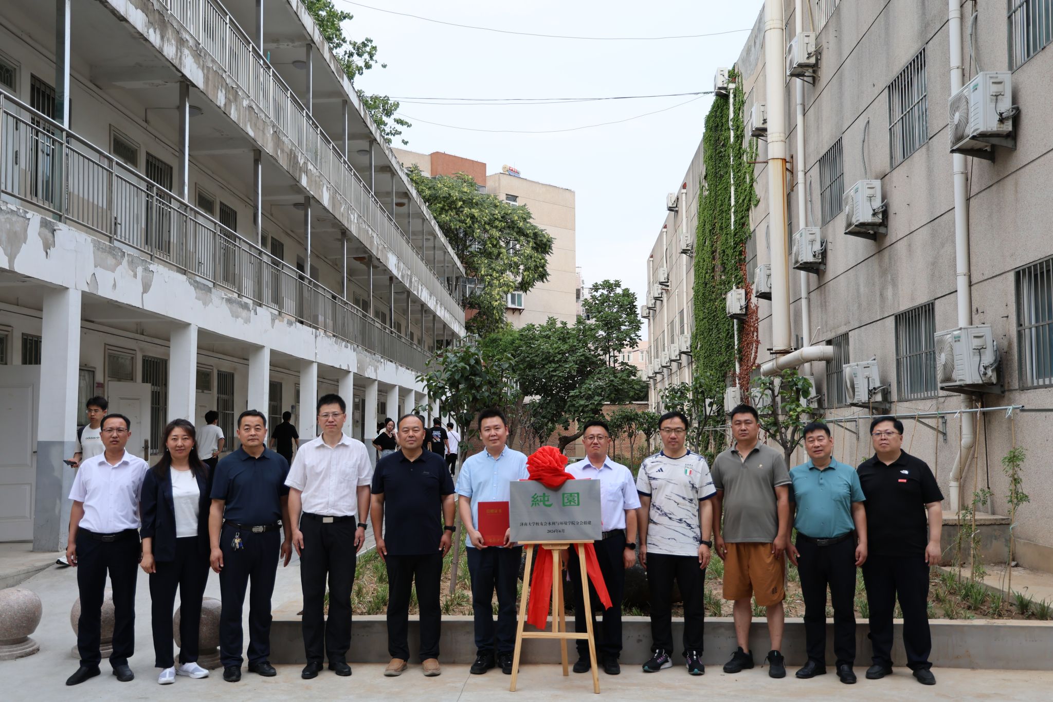 分会捐建的花园“纯园”举行竣工揭牌仪式。校友代表中地宝联集团山东分公司总经理郑同明、山东省盐业集团有限公司投资发展部部长李宗建、济南黄河路桥建设集团有限公司淄博办事处主任张磊、山东正元建设公司勘察设计研究院院长助理张福军,学校合作发展处处长刘振,后勤管理处党委书记、处长栾志强、副处长刘培华,明德物业集团项目经理彭昭震,黄色影片