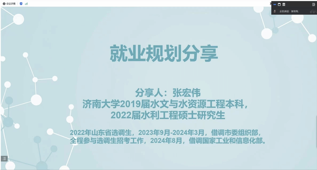 为着力提升就业指导及服务的精确度和实效性,全力支持学院有考公意向学生深入了解考公政策和备考策略,12月19日下午13:00,学院邀请2022届水利工程硕士研究生张宏伟做就业规划分享会。此次活动由学院团委书记张通主持,学院各年级学生代表参会。